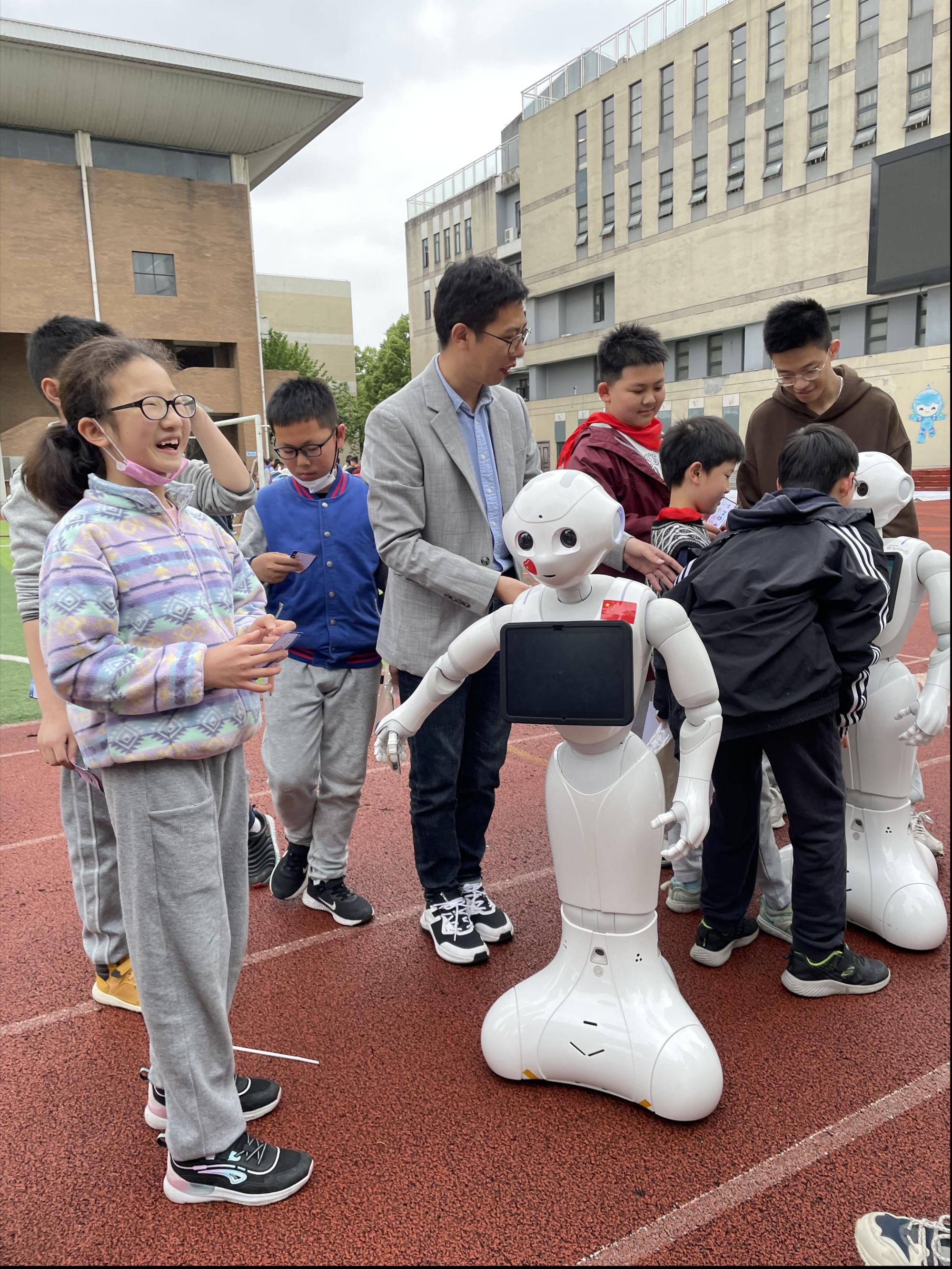 来自老金沙9170登录入口人工智能体验园的机器人们不仅会唱歌、跳舞、对话、握手,还会变身成为小小“党史宣讲员”。孩子们见状蜂拥而至迅速围了过来,吵着闹着要老师讲解机器人的功能,争先恐后地要跟机器人们零距离接触,来自浙江经贸职业技术学院应用工程学院的大学生志愿者们也纷纷上前与我院老师同学交流起来。在机器人“信小智”《唱支山歌给党听》的歌舞表演声中,文海小学操场的西南角开展着一场关于人工智能教育与党史教育相融合的精彩盛宴。