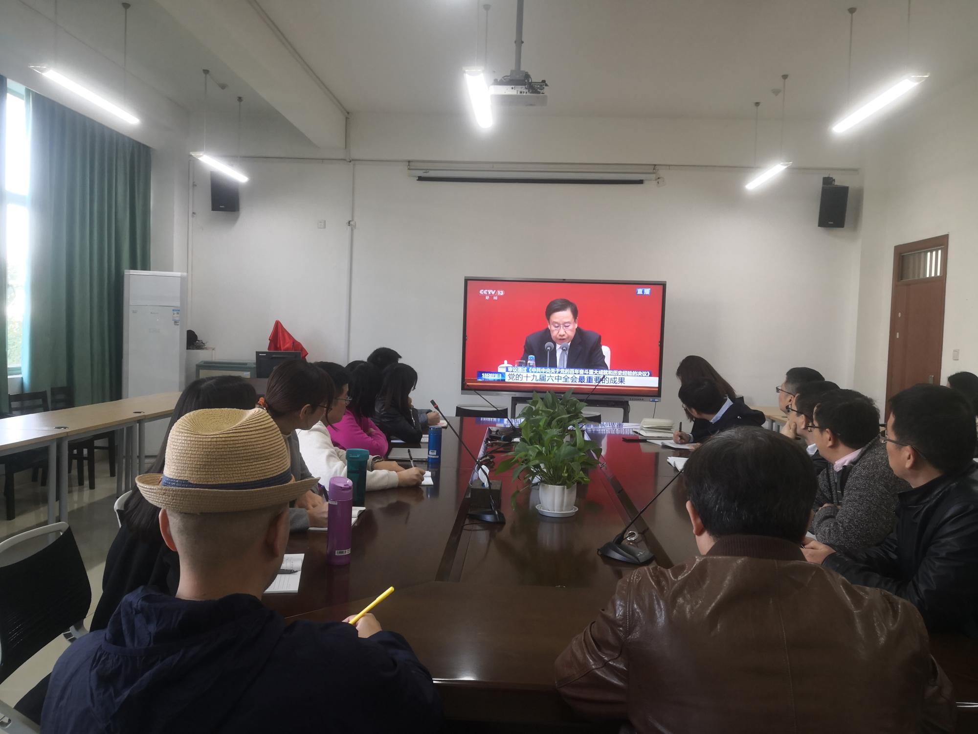 11月12日,老金沙9170登录入口党委组织师生收听收看党的十九届六中全会精神。上午10点,老金沙9170登录入口党委领导班子、理论中心组成员、党支部书记、教师代表以及全体党员在学校集中收看新闻发布会,部分外出访学党员也准时上线收看新闻发布会。党的十九届六中全会全面总结了党的百年奋斗重大成就和历史经验,为我们党员开拓创新、圆伟大复兴中国梦指明了前进方向。党员在学习完全会精神后都颇有感触: