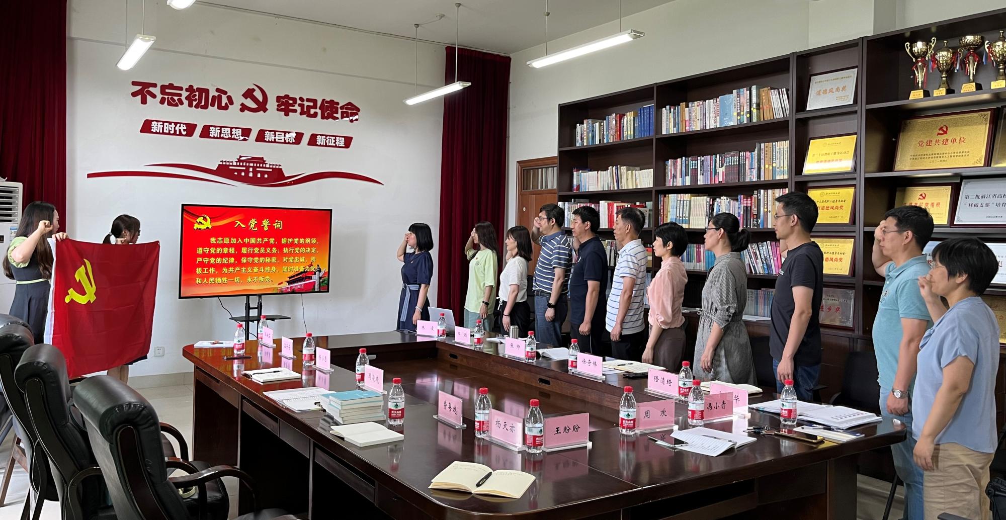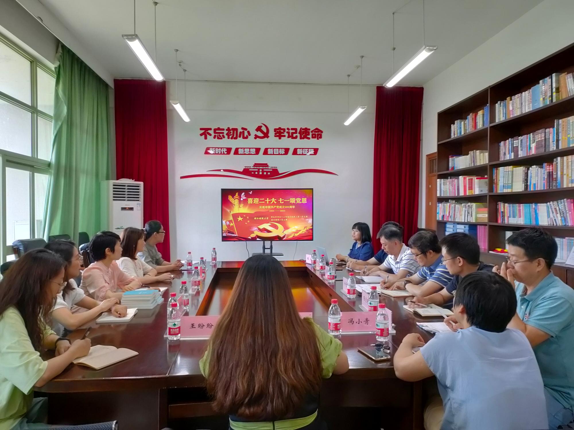 正值中国共产党成立101周年,老金沙9170登录入口教工第一党支部与图书馆第二党支部联合学习宣传贯彻省第十五次党代会精神,集体过政治生日,重温入党誓词,喜迎二十大。