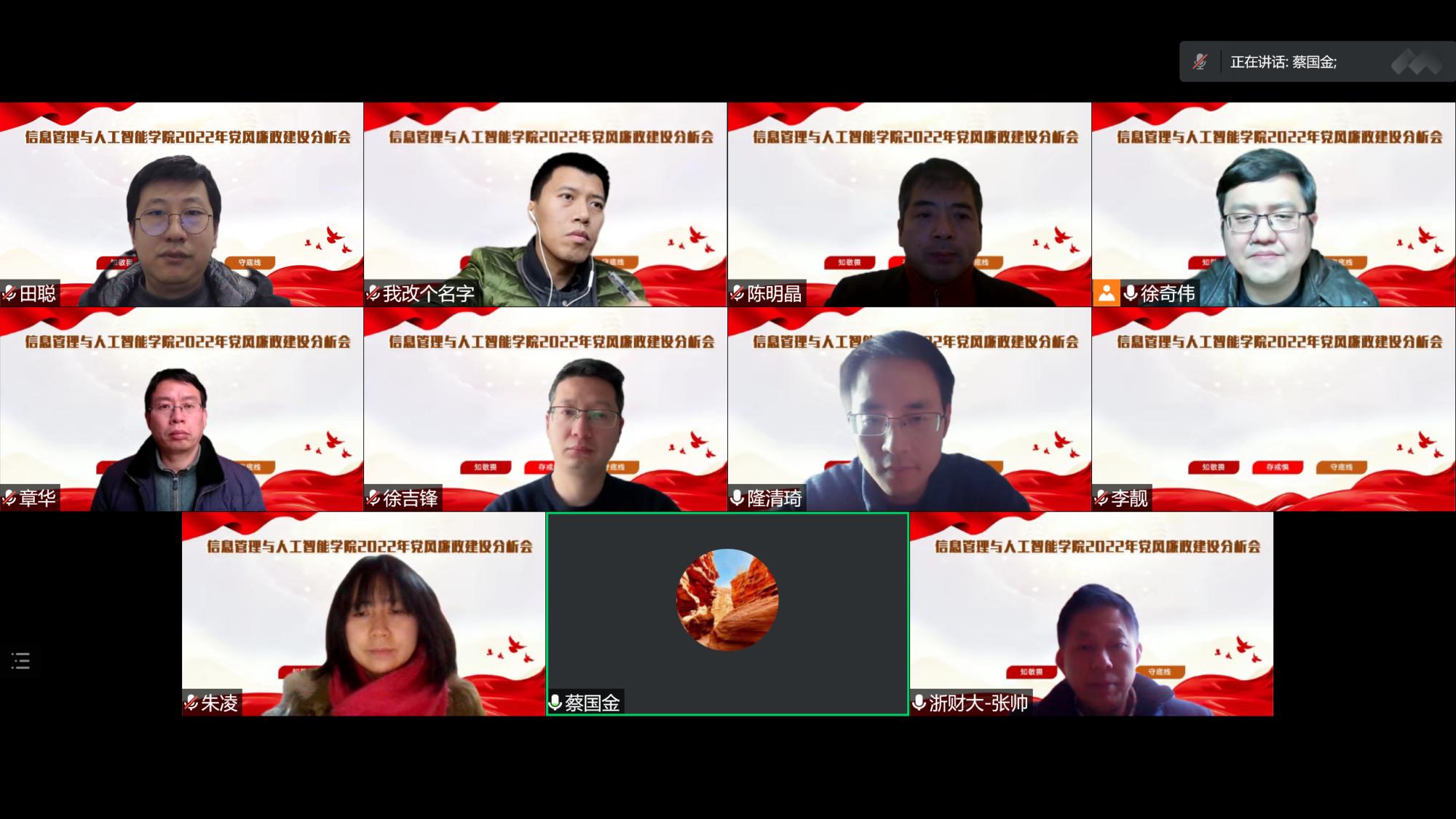 1月10日下午,老金沙9170登录入口召开2022年度党风廉政建设情况分析会。校纪委委员、金融学院党委书记蔡国金,学院领导班子成员,学院党委委员、纪委委员出席会议。会议在线上举行,由学院党委书记徐奇伟主持。